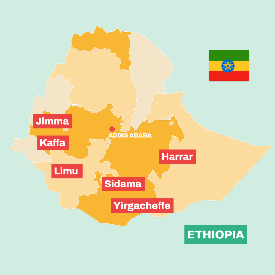 The Ethiopian coffee regions are famous all over the world: Harrar, Yirgacheffe, Sidama - producing coffees characterised by rich, uncommon and complex notes of citrus, flowers and fruits.
